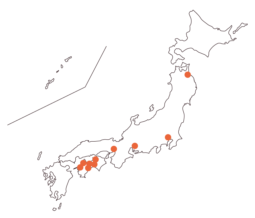 弊社商品を様々な店舗様でお取り扱いいただいております。青森、関東、愛知、関西、四国まで全国的に販売店舗を広げています。
